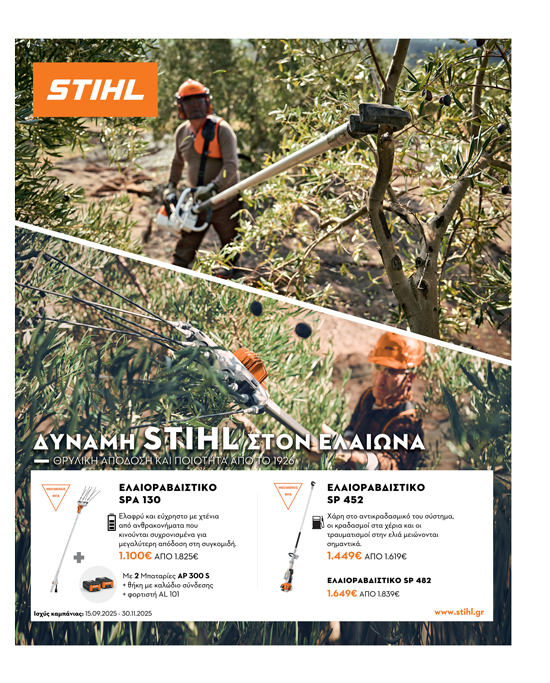 Η STIHL, µε παρουσία σχεδόν ενός αιώνα στην τεχνολογία δασικών και αγροτικών µηχανηµάτων, γνωρίζει πως η επιτυχία στον ελαιώνα δεν εξαρτάται µόνο από την ισχύ, αλλά και από την ακρίβεια, την εργονοµία και τη φροντίδα για το δέντρο. Κάθε µηχάνηµα που φέρει το όνοµα STIHL έχει σχεδιαστεί µε γνώµονα τη µακροχρόνια αντοχή, την άνεση του χειριστή και τον σεβασµό προς τη φύση.