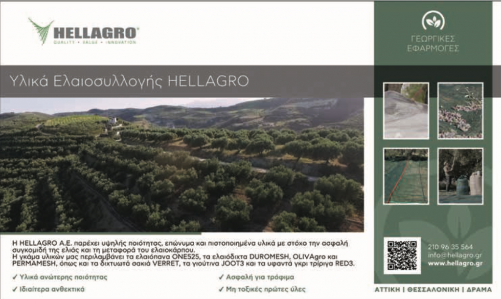 H HELLAGRO διαθέτει όλα τα απαραίτητα υλικά για να υποστηρίξει µια επαγγελµατική και αποδοτική συγκοµιδή – από ανθεκτικά ελαιόπανα και δίχτυα, µέχρι σακιά µεταφοράς καρπού, µε ποιότητα που ανταποκρίνεται στις απαιτήσεις κάθε παραγωγικής µονάδας.
